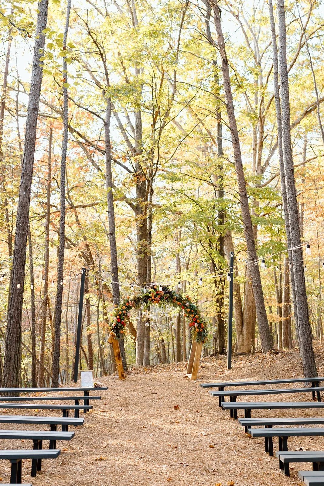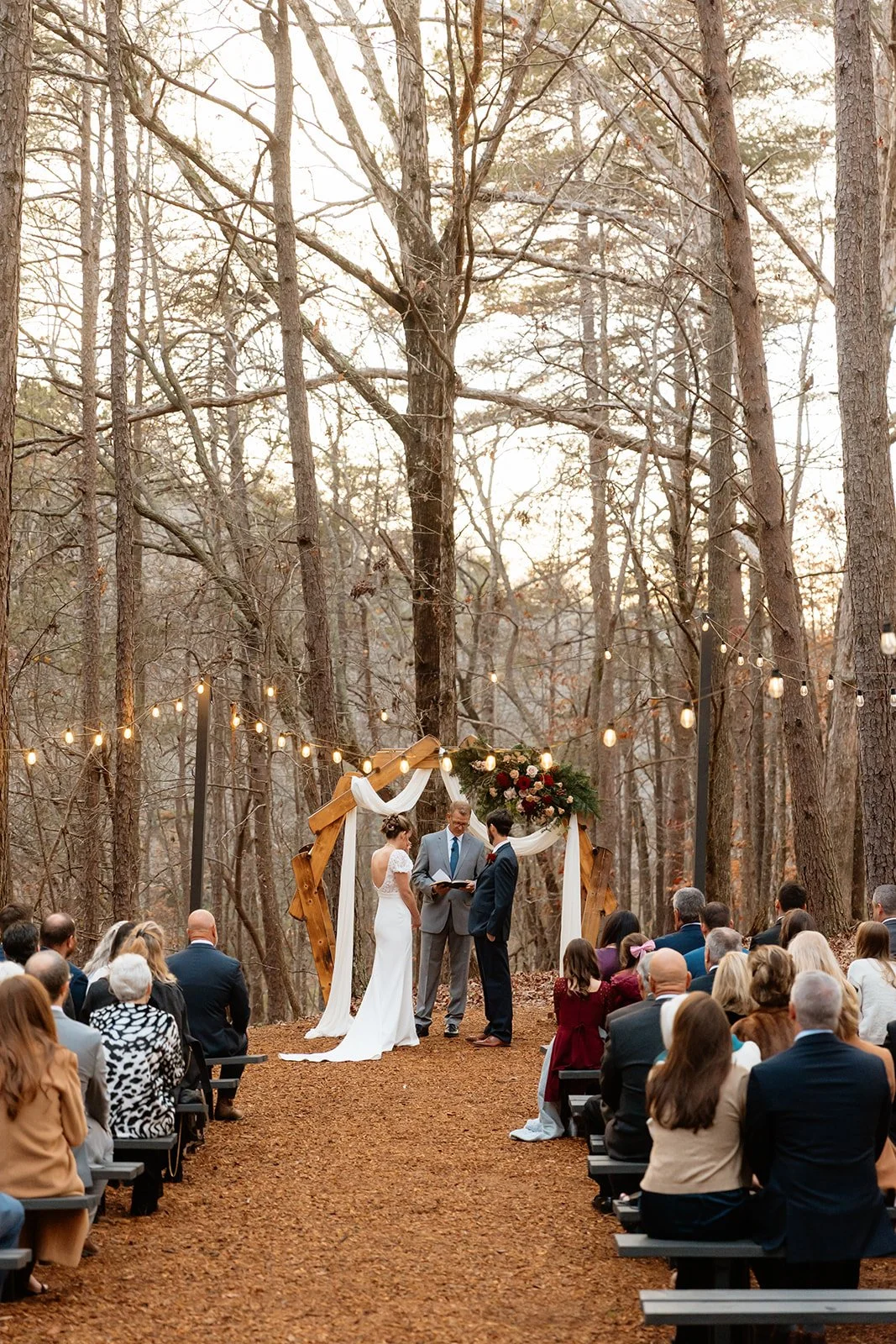 A woodsy wedding immerses guests in the serene beauty of nature, seamlessly blending the elegance of a celebration with the charm of the outdoors. Tall trees provide a natural canopy, their leaves rustling gently in the breeze.