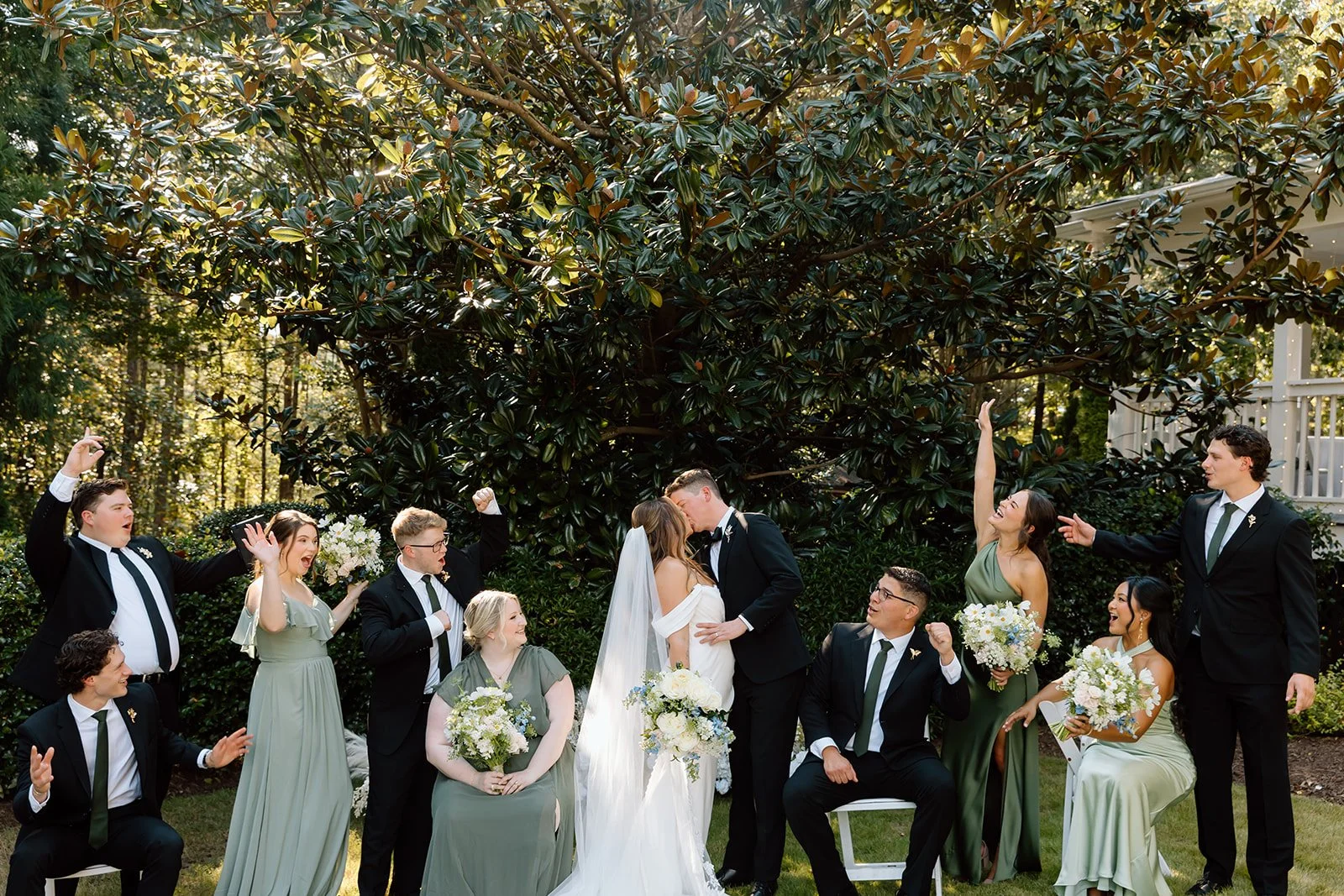 A front yard wedding takes on a spectacular charm when held beneath the sweeping branches of a magnolia tree. The tree stands as a natural backdrop, its glossy green leaves and fragrant white blooms providing a picturesque backdrop for the couple's vows.