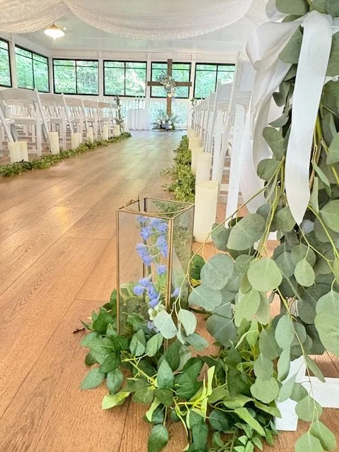 The ceremony area is set against a natural woods and lake backdrop, with a a natural wooden arch decorated with wildflowers and greenery, framing you as vows are exchanged.